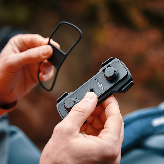 The TWIST tex base multi is now available in a “2-in-1” version. The base is simply attached to vertical straps with a rubber ring. For all horizontal straps, the already known fastening method remains unchanged: insert the strap between the two plastic plates and fasten it with the magnetic screw heads.
