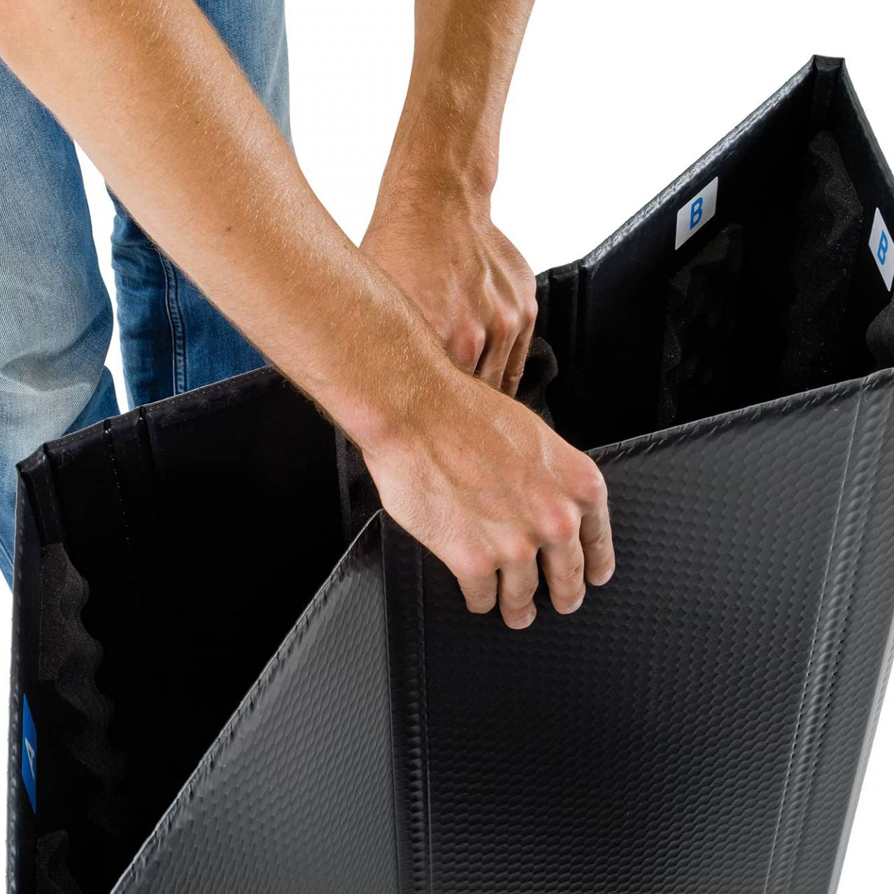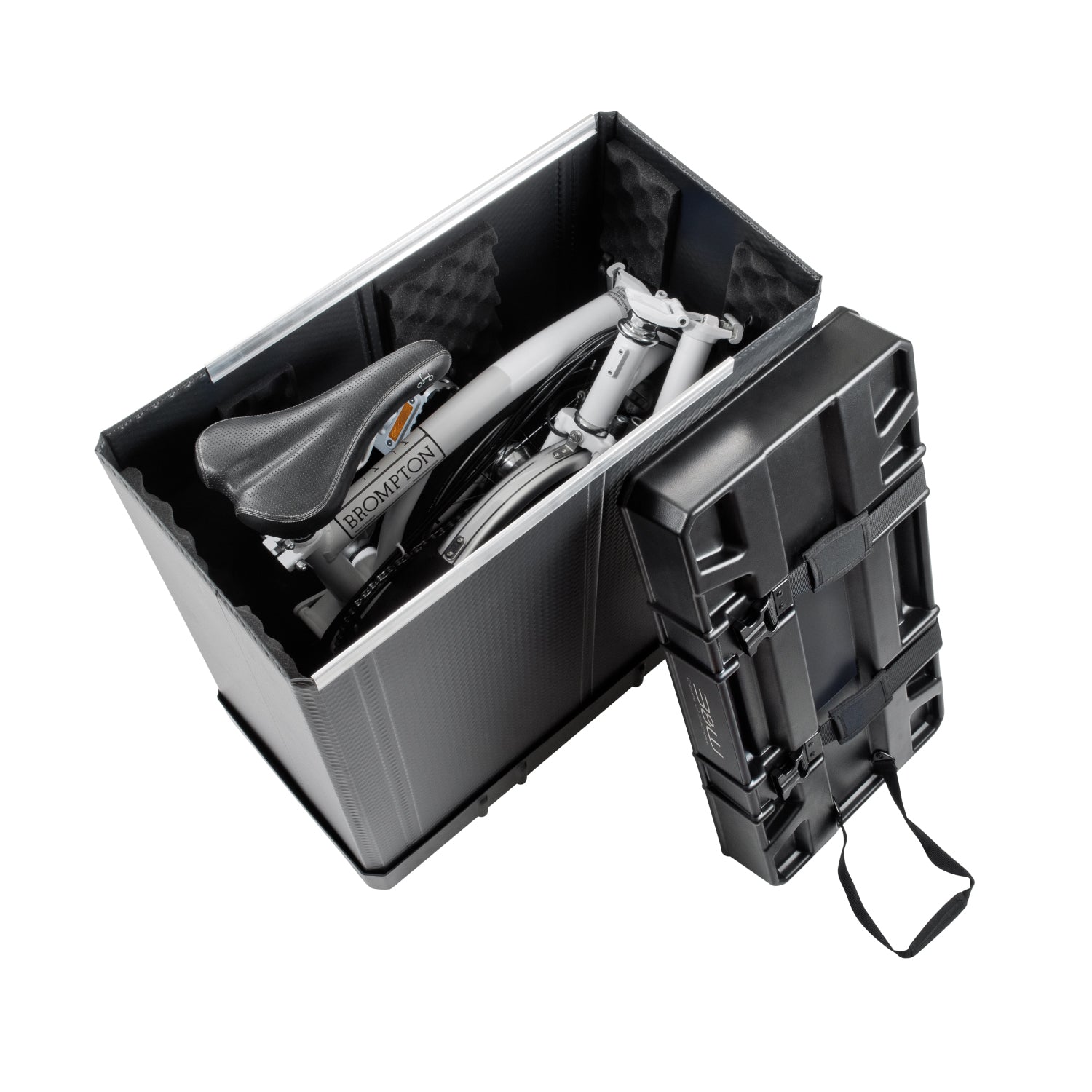 Our Foldon Box S is the perfect way to store your Brompton in any situation. The case can be assembled in less than 2 minutes and provides enough space to safely store your folding bike. To ensure the safety of your bike, the case is fitted with foam padding on all inner sides, a Con Pearl® structural chamber plate and 4 metal reinforcement profiles. When not in use, the Foldon Box S can be folded together to save space. Folding reduces the volume of the case by an impressive 70%, allowing it to fit anywhere. 2 heavy-duty straps secure the case when folded.