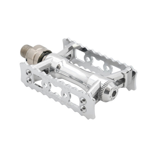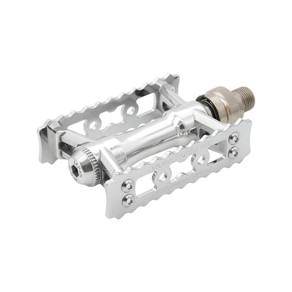 The SYLVAN TOURING pedal has the largest step area in the Sylvan line, offering various foot position over a 94 x 63 mm area to prevent fatigue. The pedal is double-sided and it is compatible with toe clips and straps to prevent slipping. This pedal works well for a wide variety types of shoes, as the cage plate tooth profile is grippy but not particular aggressive.